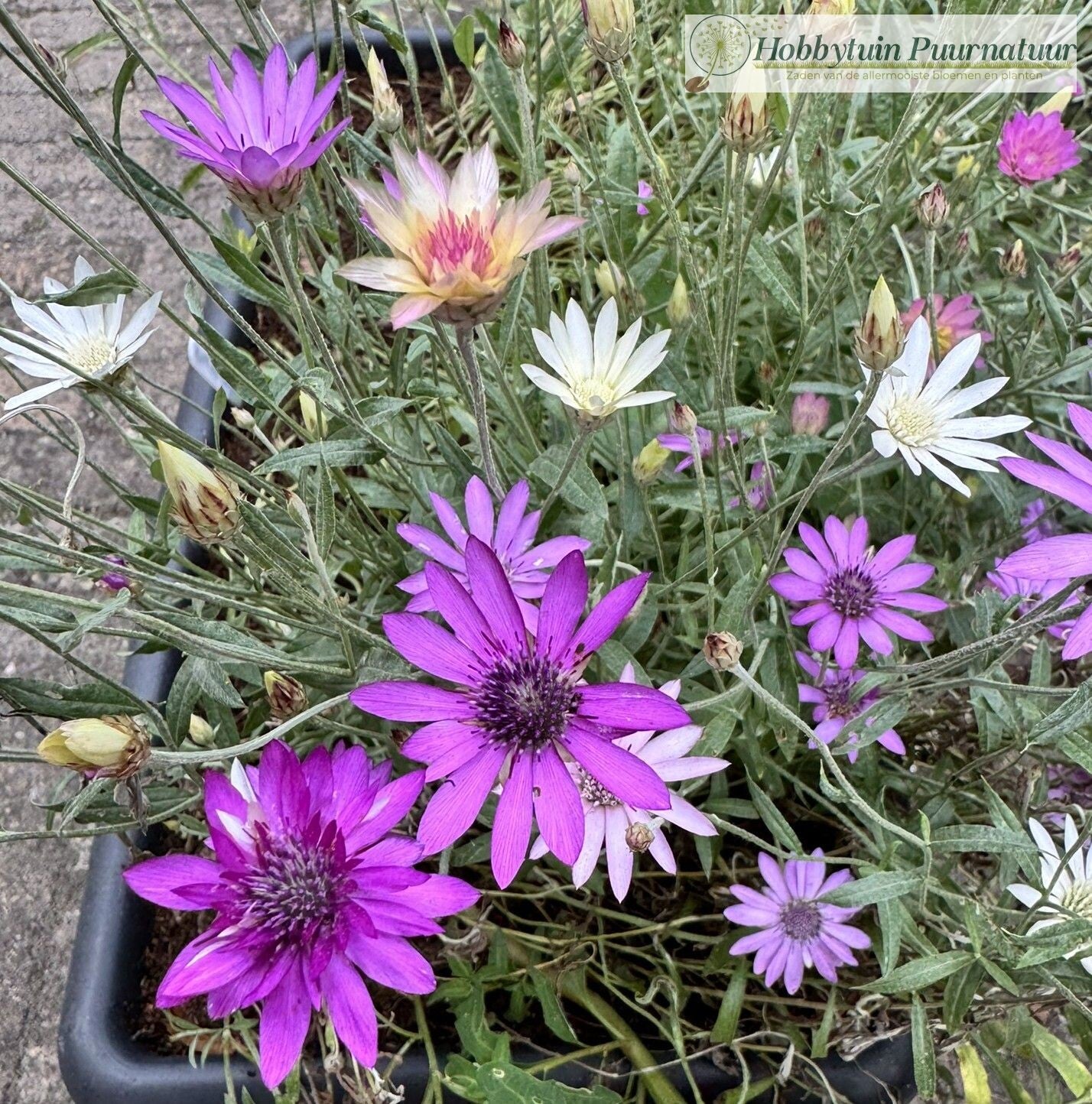 Papierbloem is eenjarig en bloeit met roze, witte en lila getinte bloemen in de maanden juli t/m september.