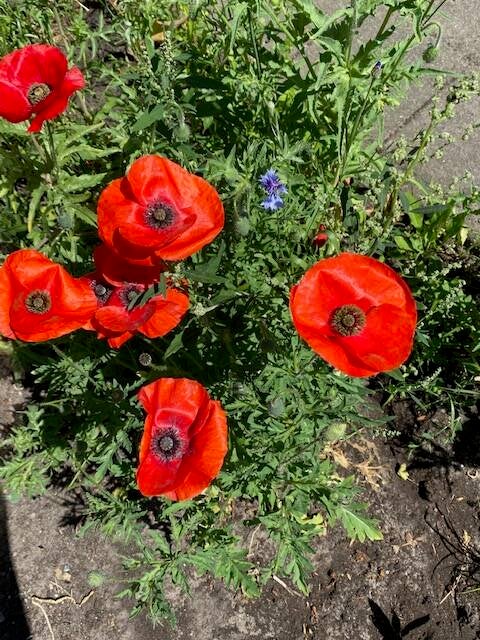De bloemen zijn felrood met een donker hart en hebben een dunne, papierachtige structuur.
