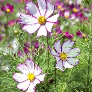 Cosmea Tip Top is een eenjarige en bijzondere variant, witte bloemen met een paars randje om elk bloemblaadje, echt apart!